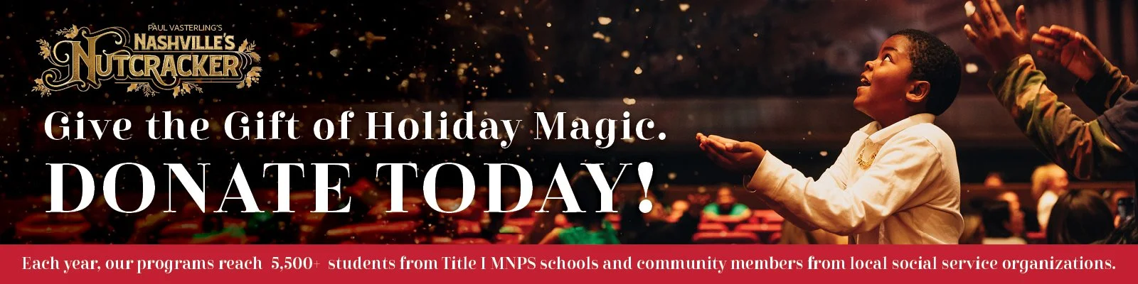 Every child deserves access to the arts! Our Student Matinee program invites students to experience a live performance of Nashville’s Nutcracker during a day-time school field trip. The performance is accompanied by an Educator’s Guide, with activities that meet Tennessee State Academic Standards. We hope to reach 1,600+ students this holiday season.